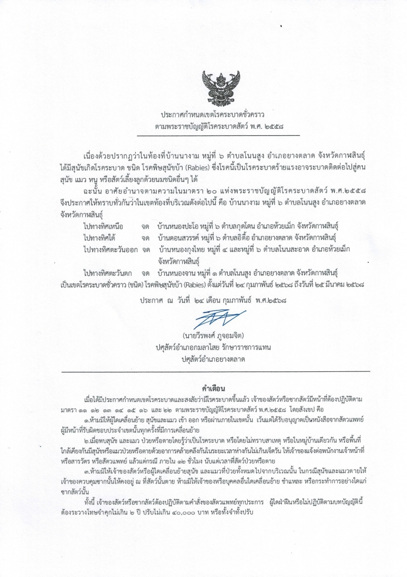 เป็นเขตโรคระบาดชั่วคราว (ชนิด) โรคพิษสุนัขบ้า ตั้งแต่วันที่ 24 กุมภาพันธ์ - 25 มีนาคม 2568