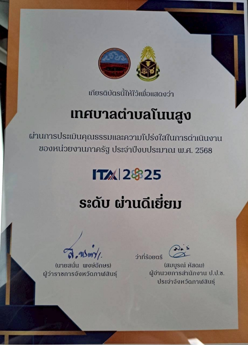นายเตียง ภูพลผัน นายกเทศมนตรีตำบลโนนสูง เข้ารับมอบเกียรติบัตร การประเมินคุณธรรมและความโปร่งใสในการดำเนินงานของหน่วยงานภาครัฐ ประจำปีงบประมาณ 2568 (ITA 2025) จาก นายสนั่น พงษ์อักษร ผู้ว่าราชการจังหวัดกาฬสินธุ์ เทศบาลตำบลโนนสูง ได้รับผลการประเมิน ระดับ ผ่านดีเยี่ยม ได้ลำดับที่ 1 ของอำเภอยางตลาด ลำดับที่ 4 ของจังหวัดกาฬสินธุ์ คะแนน 99.00